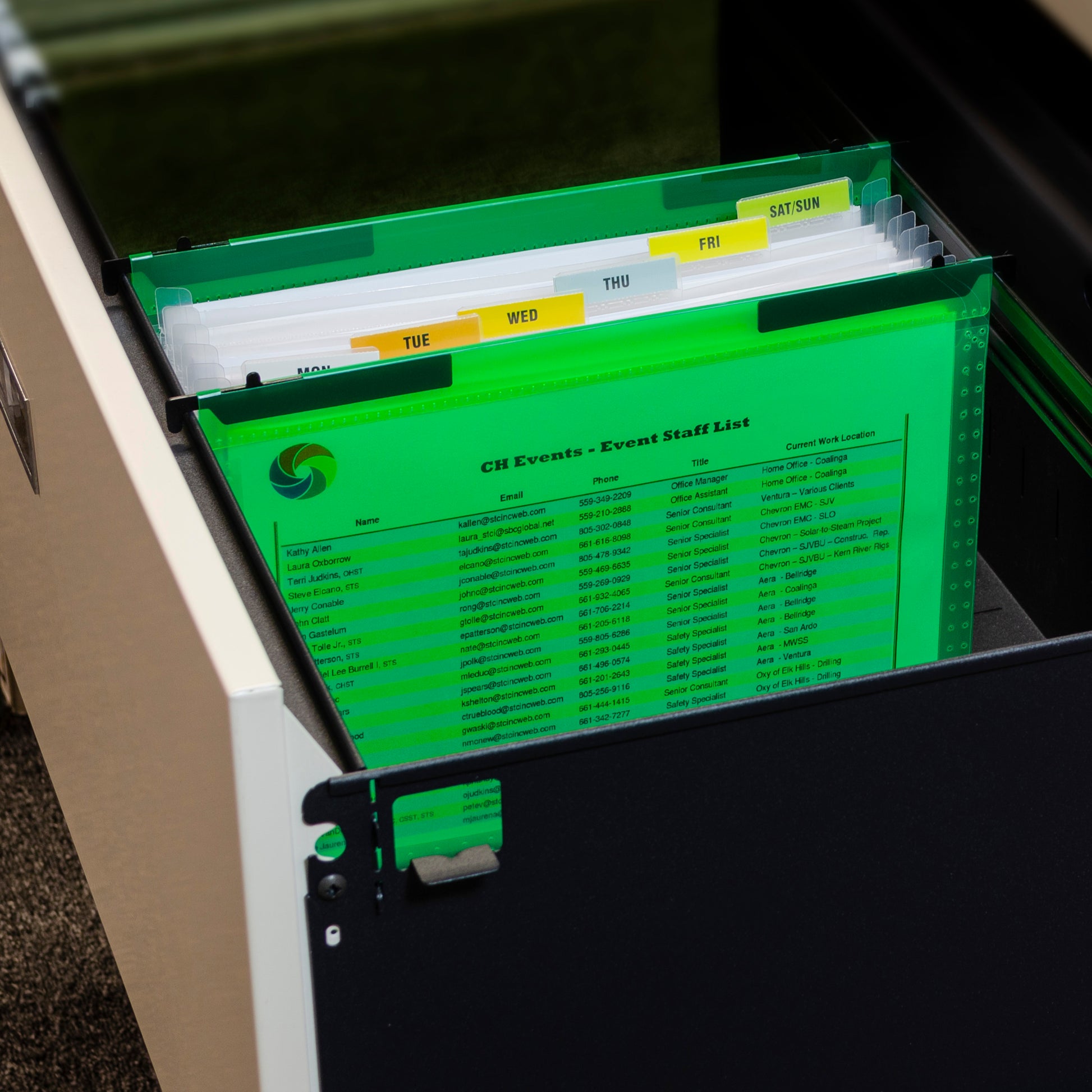 Combine the function of an expanding file with a filing cabinet by using the versatile Expanding File with Hanging Tabs. This file itself is a storage system offering a variety of uses.