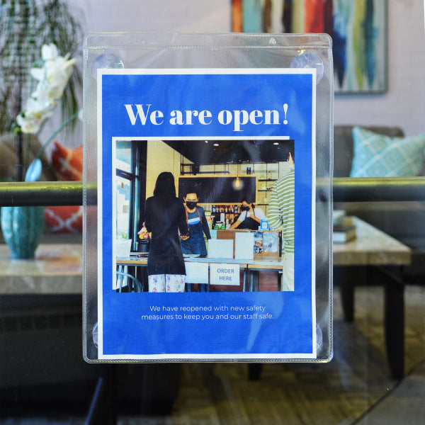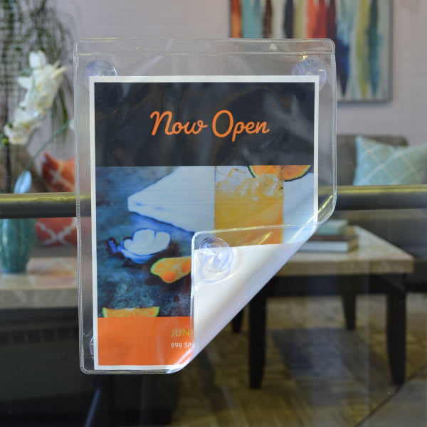 Heavyweight Display Pocket makes it easy to showcase information on a window by using the attached suction cups to affix the pocket.