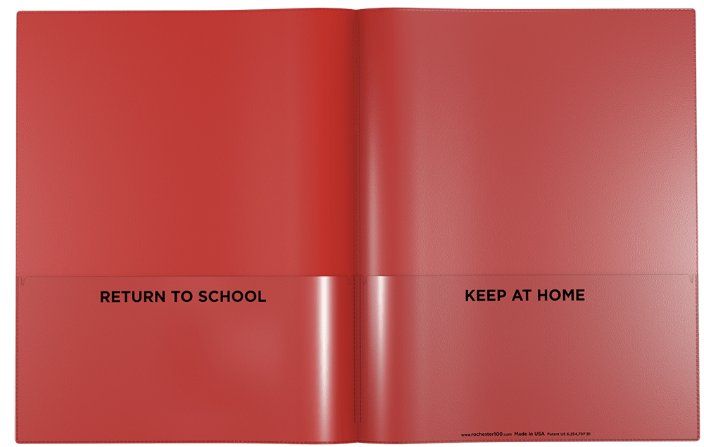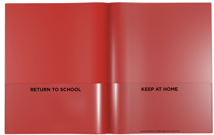 Each plastic folder features two 4 ½” clear pockets on the inside that are clearly printed with “Return to school” on the inside left pocket and “Keep at home” on the inside right pocket so you can easily keep track of assignments, notes, and permission slips that need to be sent back to school, as well as graded work and classroom updates that can stay at home. Color changes for the wording printed on these folders can also be requested!