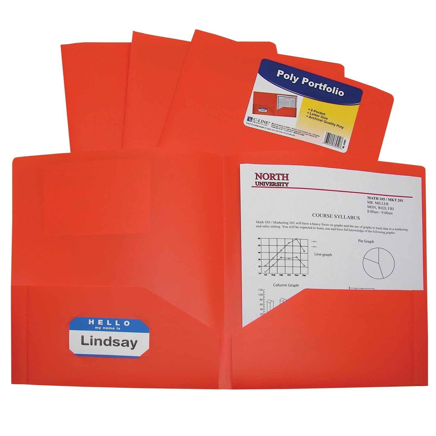 Two-pocket heavyweight polypropylene portfolios / folders hold papers and resist tearing.